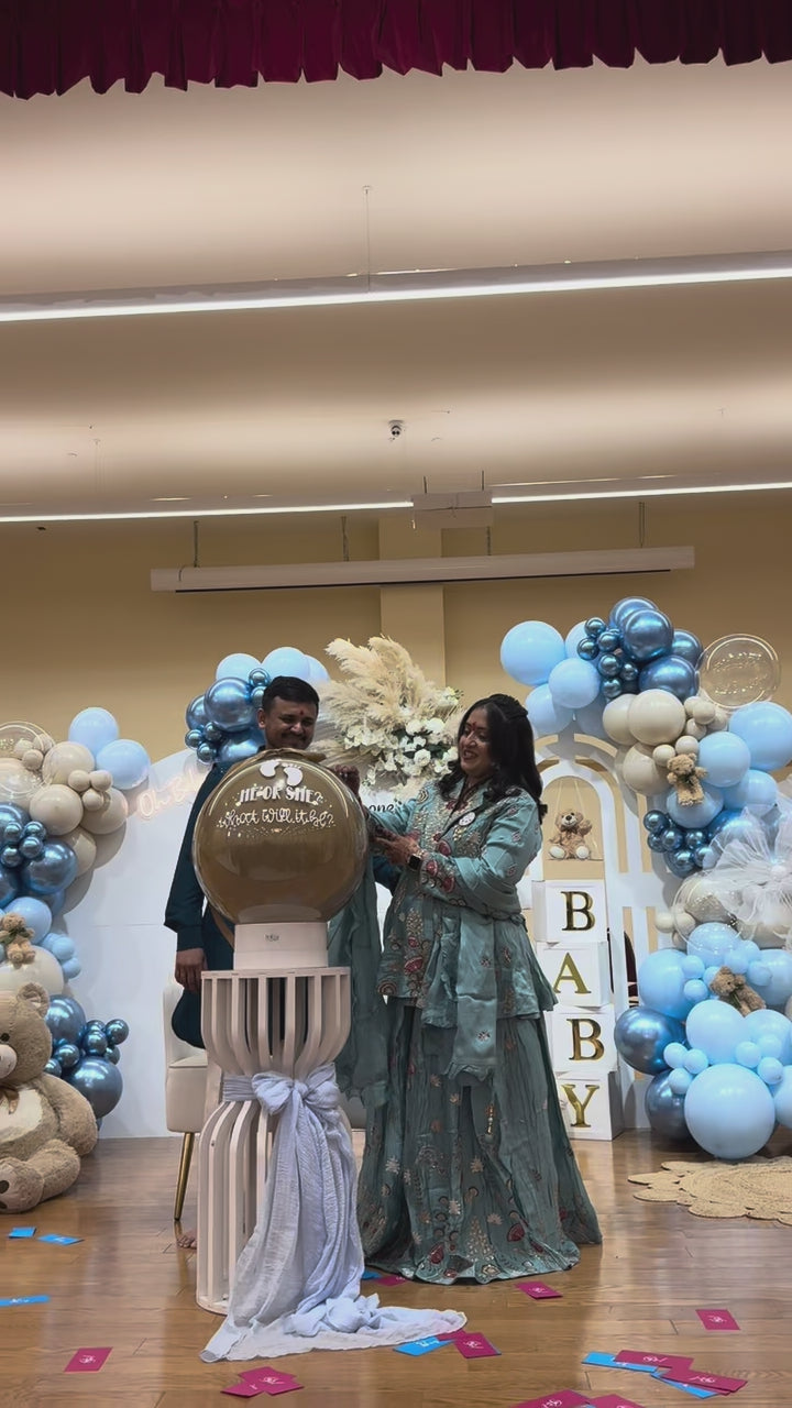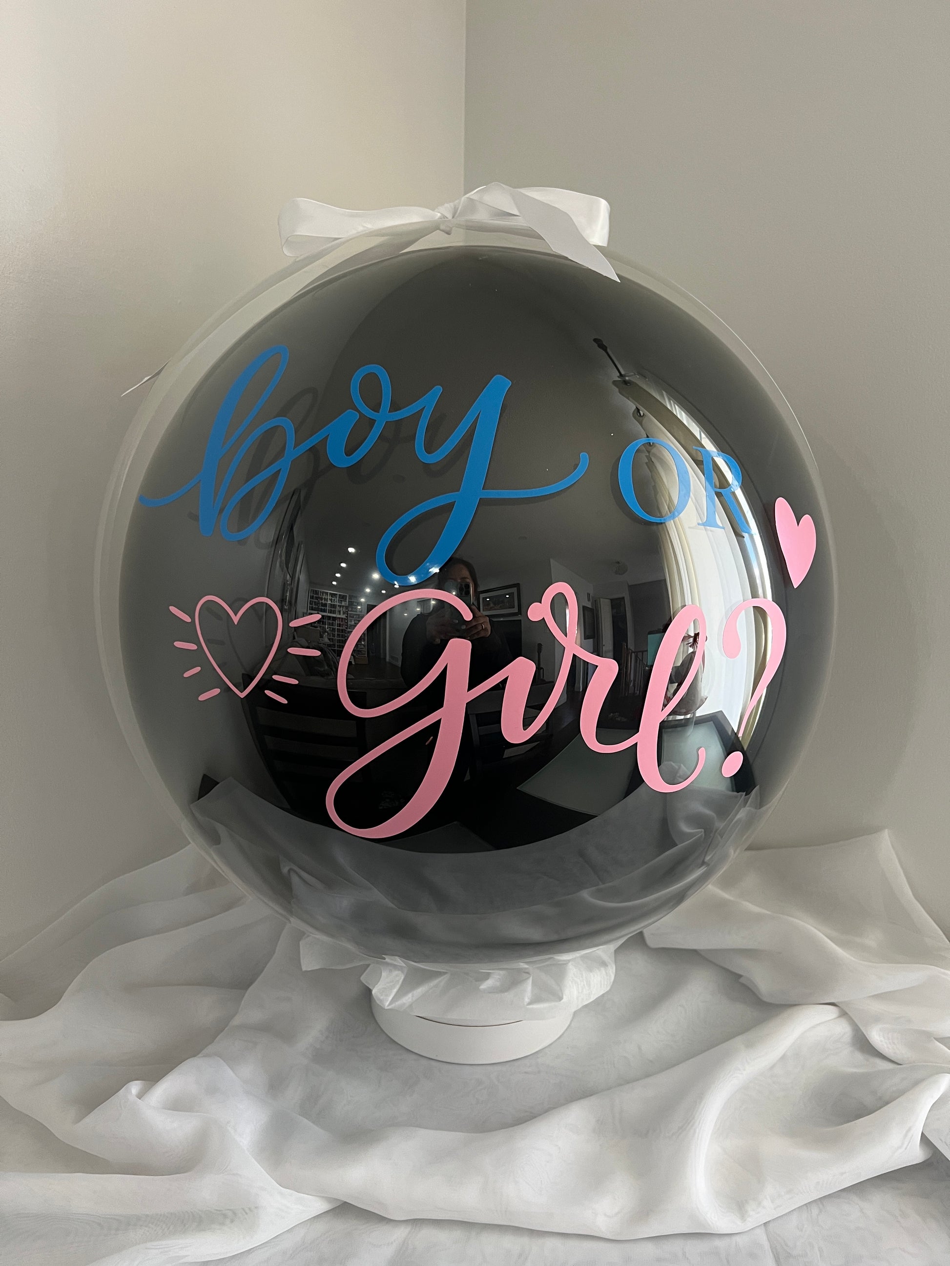 No mess gender reveal pop. Comes with blue or pink powder inside. Please write in additional note box the writing on balloon