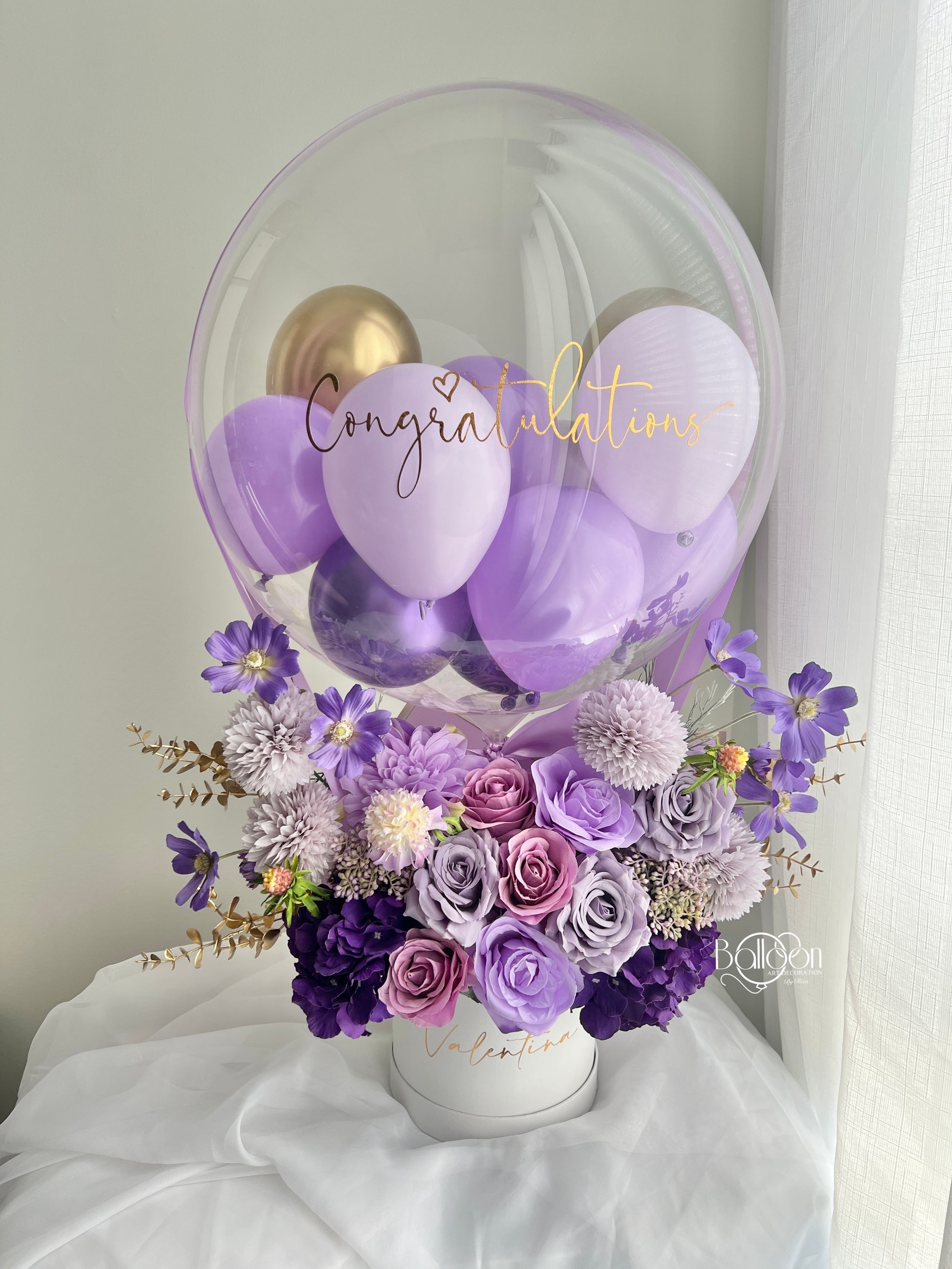 - Clear Balloon filled with mini balloons and custom writing