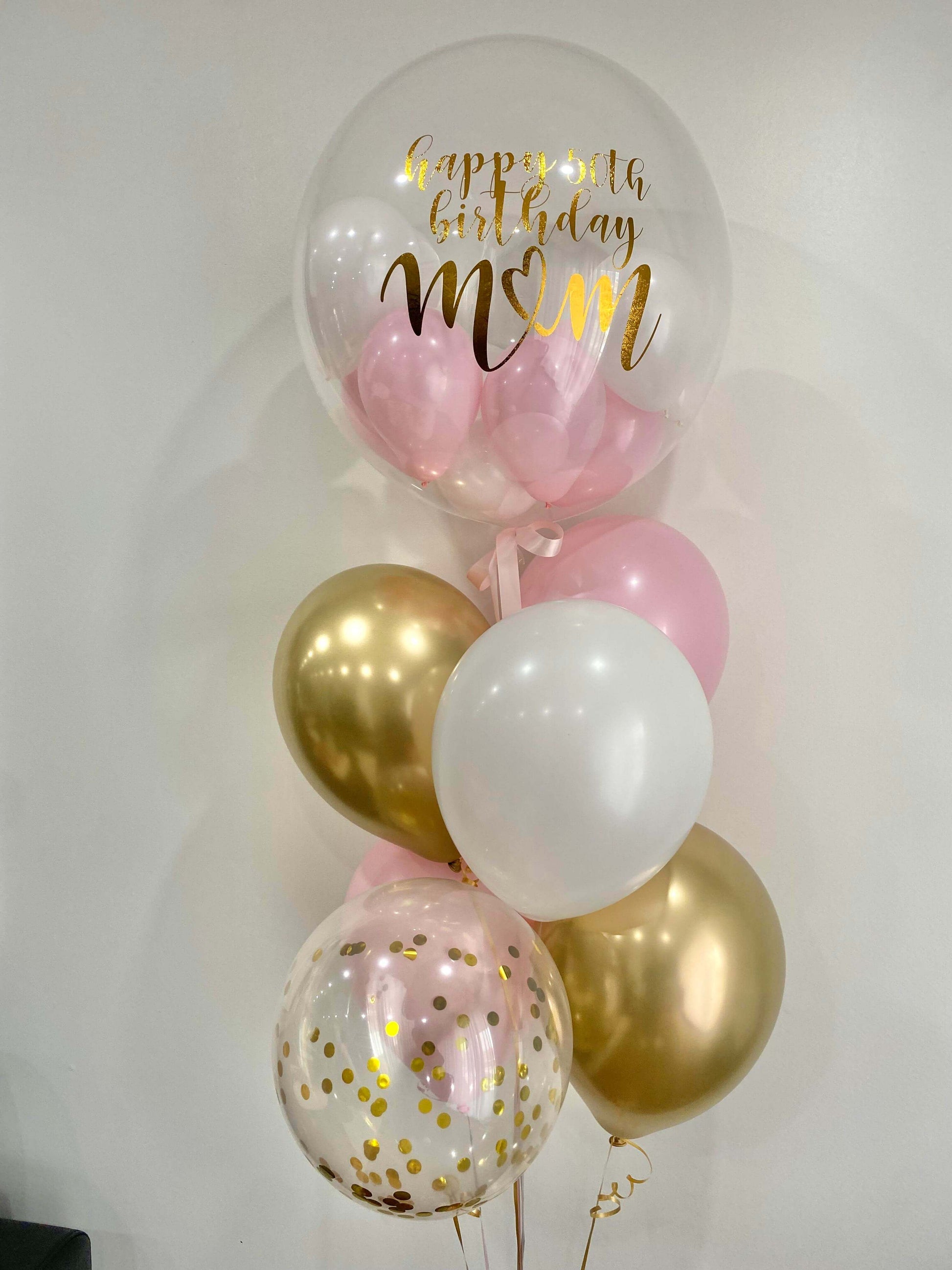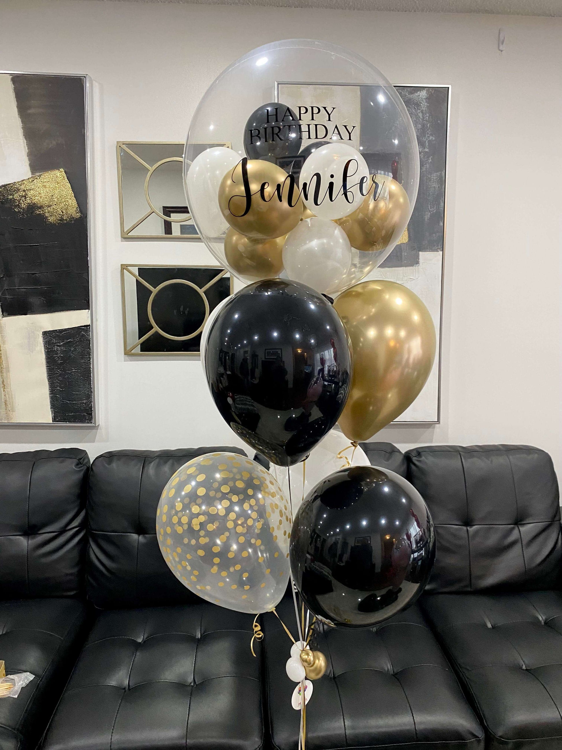 - It comes with a 24 inch helium-inflated personalized balloon stuffed with 12 mini balloons surrounded by 6 pieces of 11 inch helium-inflated latex balloons.